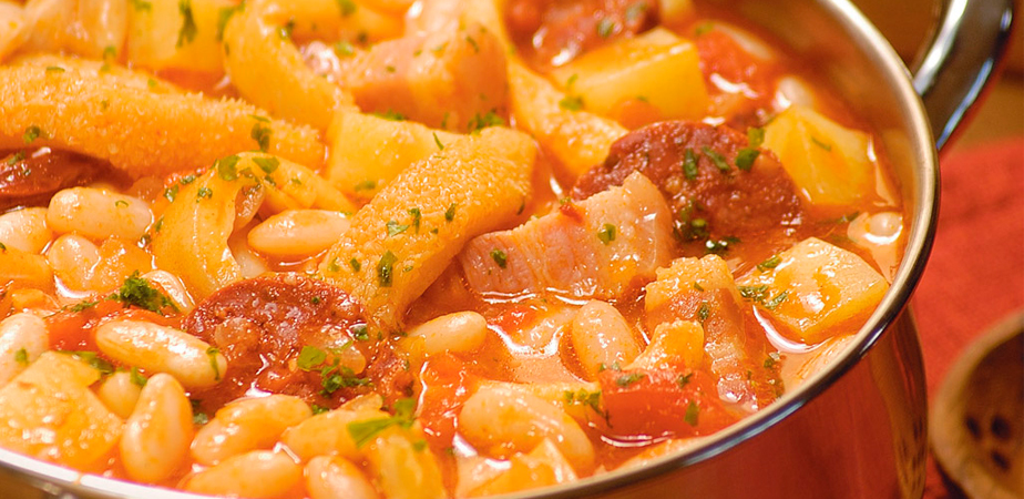 Calentar una olla, verter el Aceite, rehogar las cebollas picadas y una vez que estén transparentes agregar el chorizo colorado en rodajas, el ajo y el perejil, dorar 1 minuto más e incorporar las tiras de mondongo, el tomate, los porotos previamente hervidos en abundante agua con sal, las papas, la panceta, el caldo y condimentos.